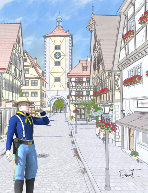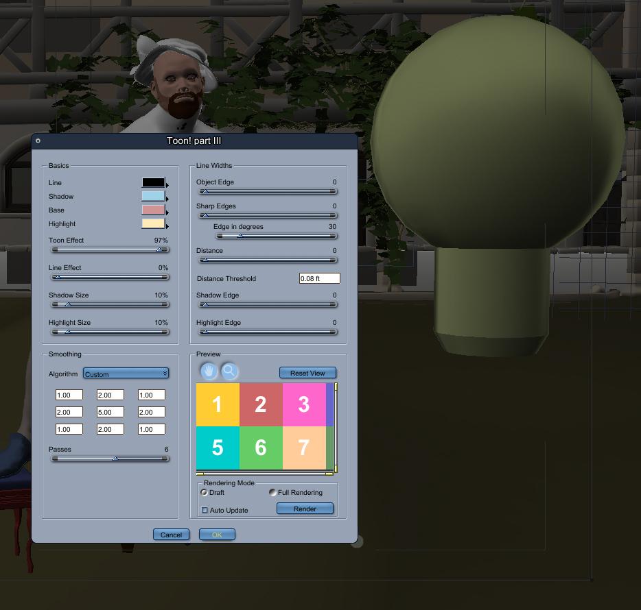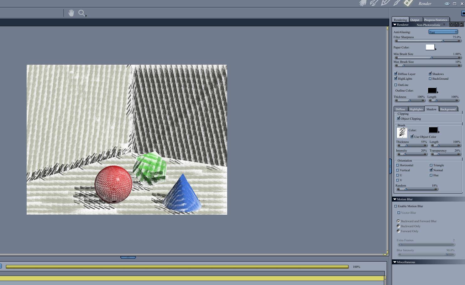 On the other hand, the Non-Photorealistic Renderer (NPR) is not a scene filter, it is an alternative rendering engine.  It is based on simulated brush strokes.  It is accessed in the rendering room.  Go to the very top just under the Rendering tab, there is a drop down menu to choose among "Draft," "Non Photorealistic," "Normal Map," or "Photorealistic."  Just choose Non-Photorealistic and the menu options will change. Here, I have done a test render of the NPR renderer with the default settings of the same scene as the toon above.