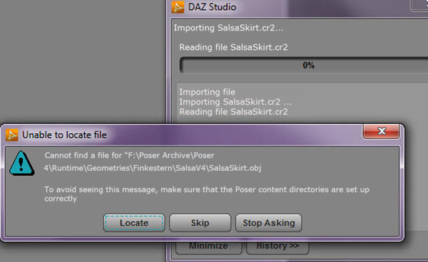 I have a clothing set I'm trying out. All items in the set work except this one (the skirt) - I'm looking for help understanding the error message I get when I try to load it. I have the "cr" file, but DAZ says it's looking for an obj file (??) I have no idea what this implies/where the file might be since I don't even have a F\Poser Archive\ etc. Suggestions please? (I realize part of the problem is that I don't understand the relationship between "cr" and "obj" files . . . on the other hand, all the other items in the set seem to work fine).