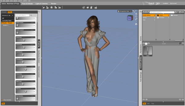 You would pick something I don't own! None the less..after you load the garment into the scene then you would go to properties and select Misc. and use the fit to option in that. The next part of the explanation is more tricky. Many poses will be fine to just do a regular static drape and have the clothes work properly. That is in the dynamic tab. Be sure to select the garment in the tab and that you have set it to collide with the figure in the "collide with". Unless the clothing will come in contact with something de-select it as it adds render time. So if you had a floor and room around your V4 you would unselected those. Same for V4's whole head because the clothing will not touch it. Then you hit the drape button. If your pose is more complex or this a fair bit of intersection of the clothing then you will want and animated drape. That simply means your going to have the clothing move along a time line to the final pose. Open the time line and have v4 in her regular 0 pose in frame 1. Around 15 or 20 on the final timeline put V4 in her final pose. This time you select animated drape and the clothing will move as she moves to the pose.