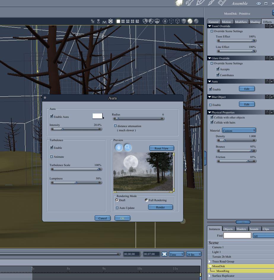 For the moon, I put a NASA pic of the moon in the color shader and the glow channel (on a uvmap template).  The moon is a vertex object.  I also used anything glows to make the moon object an emissive light, but I don't think it has much effect because of the haze.  The moon also has an aura in the effects tab.  I also made a vertex ring around the moon and applied an aura to it for greater control.