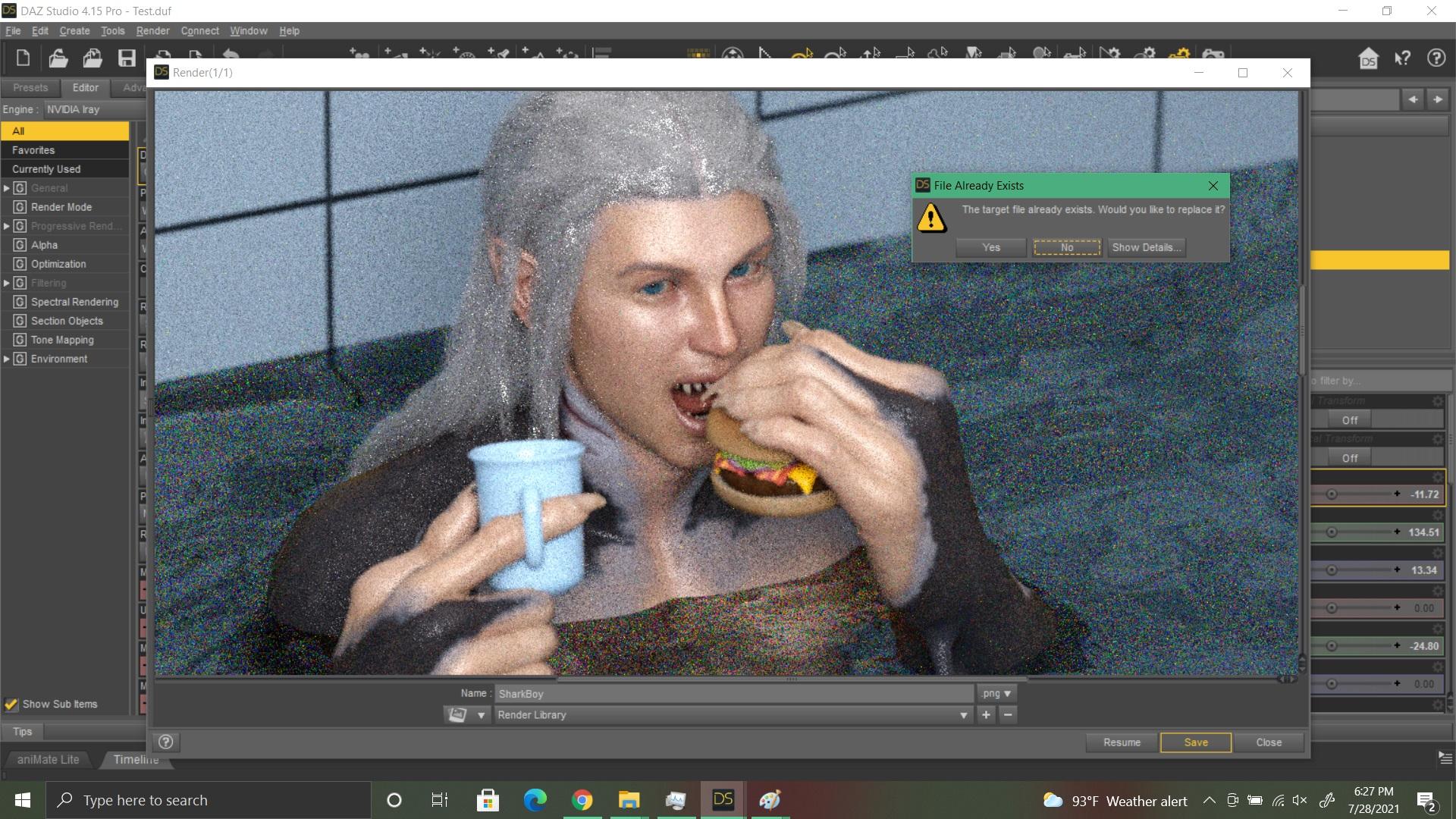 DS does not want to render this scene, but that's because my laptop is weak and this scene uses up 100% CPU. But, let me believe it's because it doesn't want shark mermen doing distance learning. Especially in such close proximity to the pool and the fact he's got his lunch waiting for him there. (Yes, he eats burgers smaller than his fists because this shark merman was raised by humans.)