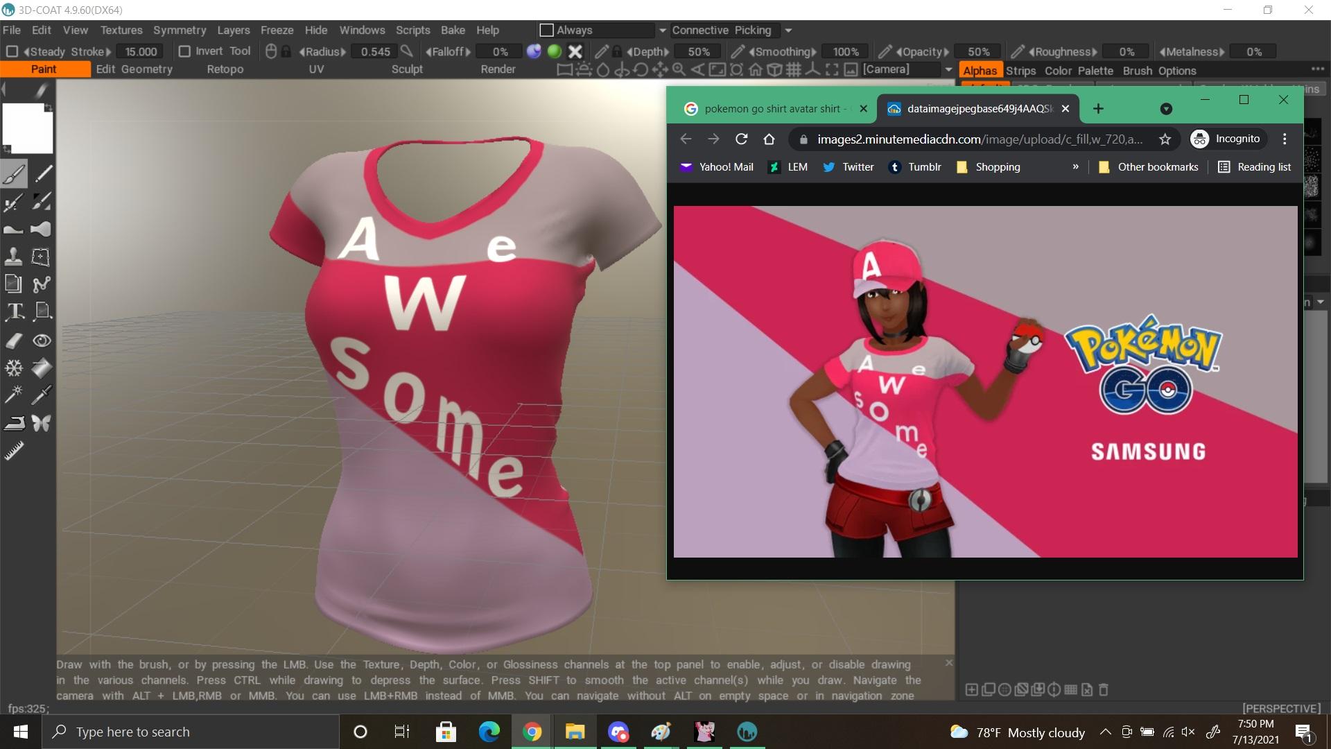 I plan on doing a proper render with this, but I eyeballed this shirt design (and used the eye dropper for the color) to use it in Aeon Soul's Everyday 2 shirt. Went between GIMP and 3DCoat. Not happy with how some of the letters turned out. But overall, I don't think it looks that bad. I need to look at that Versa Cap and Hair, and see if I can texture it to match that cap.