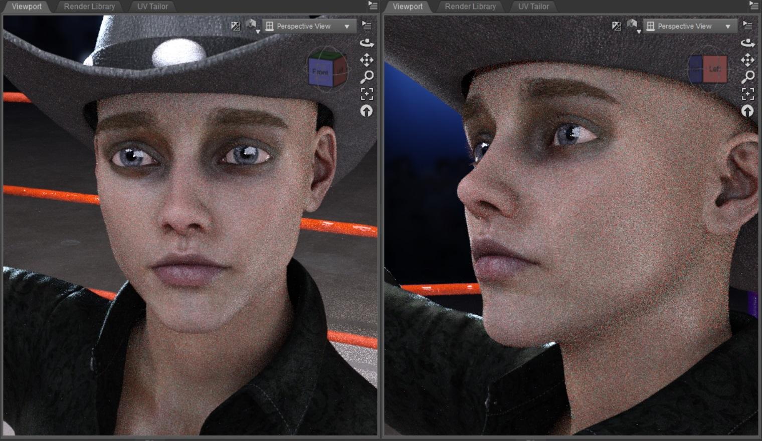 Speaking of Kayla, I'm trying to make a scene with Kayla and my G8M version of Kayla. Here is a couple of Iray previews of him, with InTheFlesh's DMC Vergil for G8M's skin. I might just end up using Kayla's skin but with Kjaer 8's eyebrows, as shown in this preview. Not too fond of the "dark circles" even though I could probably try to make him into a goth cowboy for this scene.