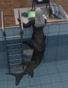 This render was made because I wanted him on his back, partially submerged. But also, I chose this angle because I once heard that a below the nose camera angle is unsexy and awkward. Finally, this water. It came out clear instead of a darker blue, the exact opposite problem of the hamburger pic render. However, this was easy to fix because all I had to do was change the diffuse color of the pool tile to a darker blue, so now the water looks like the same shade of blue as the hambuger render.