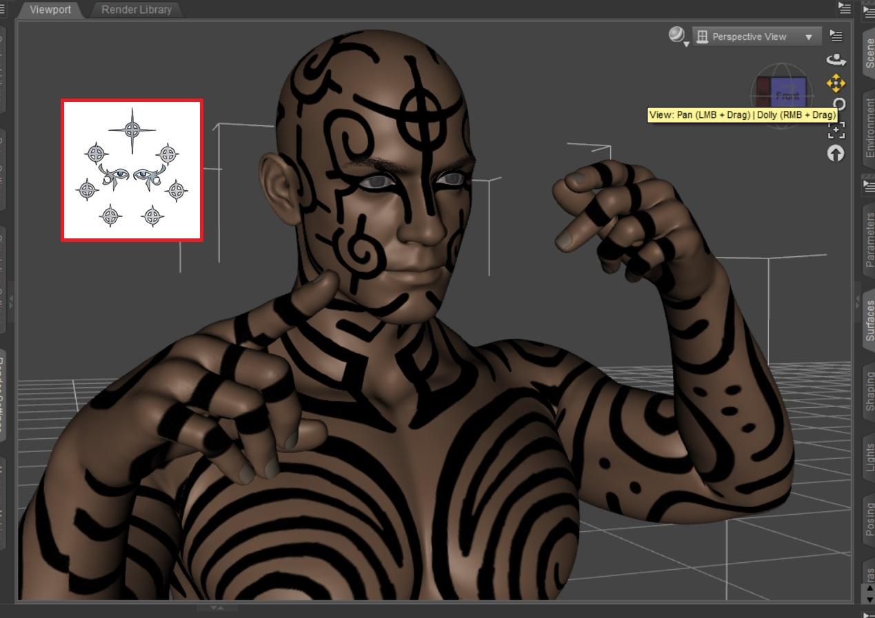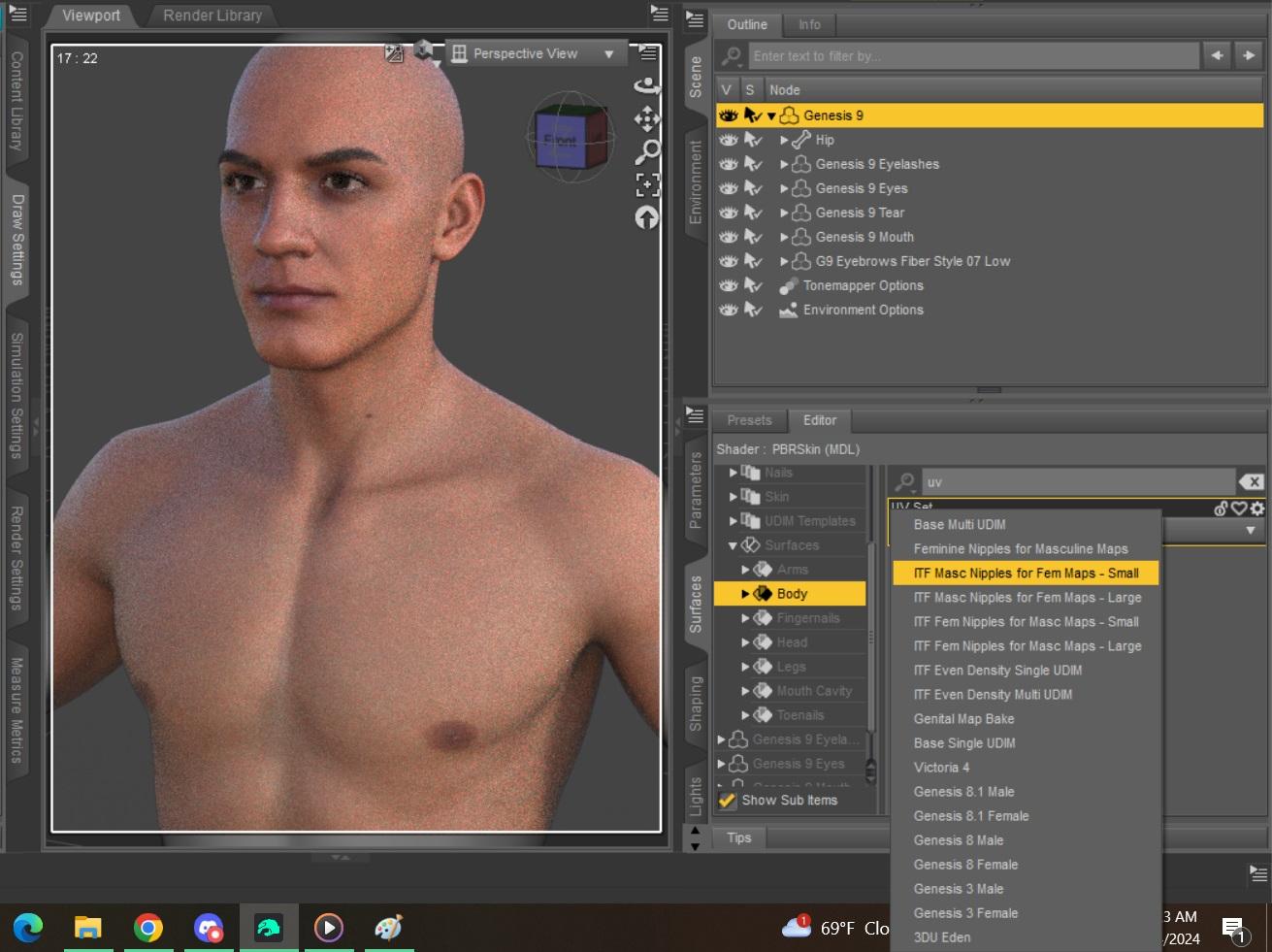 I am using InTheFlesh's ITF Dev Kit Vol. 2 (available at Renderhub and Gumroad...not sure if they're at other store fronts.) It works well and has a lot of other features I don't really use, but it has G9 chest UVs that allow the nipples to be placed in the proper masculine position. (I had seen someone mention wanting such a product, and I even made a thread a while back. From the inactivity of said thread, I will assume that I am the only person who sincerely wanted such a product. So I am satisfied with my purchase.)