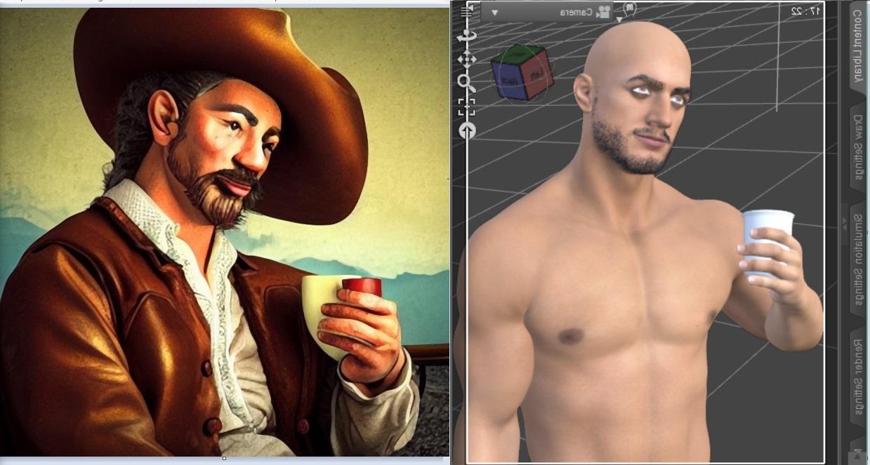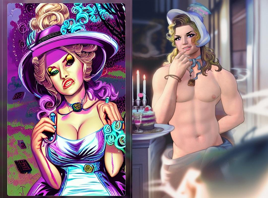 Some of my AI pics were made because I fed NovelAI some very old, distorted Wombo pics. Here is one of these pics next to the edited AI. So in other words, these are "mother and son." A few weeks ago, I asked NovelAI to give me the Mad Hatter and fed it the pastel hat lady Wombo pic. I told NovelAI that I wanted a "muscular male" at least to make sure the character was indeed male. I liked the colors on the result, but his face and hand were messed up, so I tried to recreate these with G9 Toon. But I decided to go ahead and practically replace the AI guy with the DAZ guy, except for the hat, hair, and jewelry.