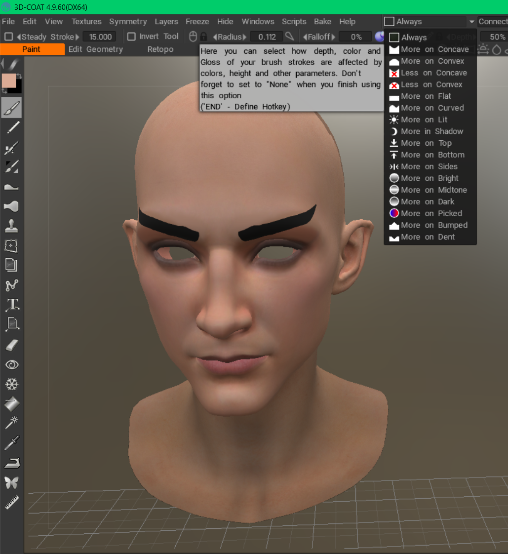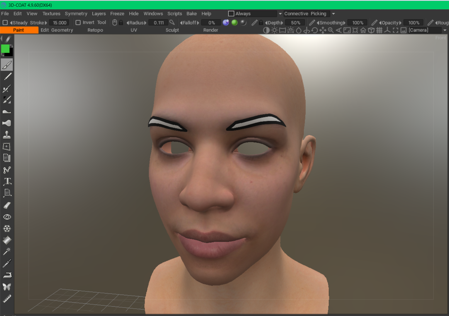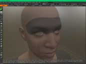 I'm working on the "normal" eyebrows. I had drawn them on 3DCoat with my laptop mousepad, then refined them with GIMP. But, I had messed up and made one eyebrow slightly higher than the other that it was still noticeable. I have since gone back and fixed it, but I'm not going to worry much on the exactness of the placement. The "realism" crowd insists that a realistic look is "slight asymmetry," so if my fix is about 1 pixel off, then that adds to the "realism."