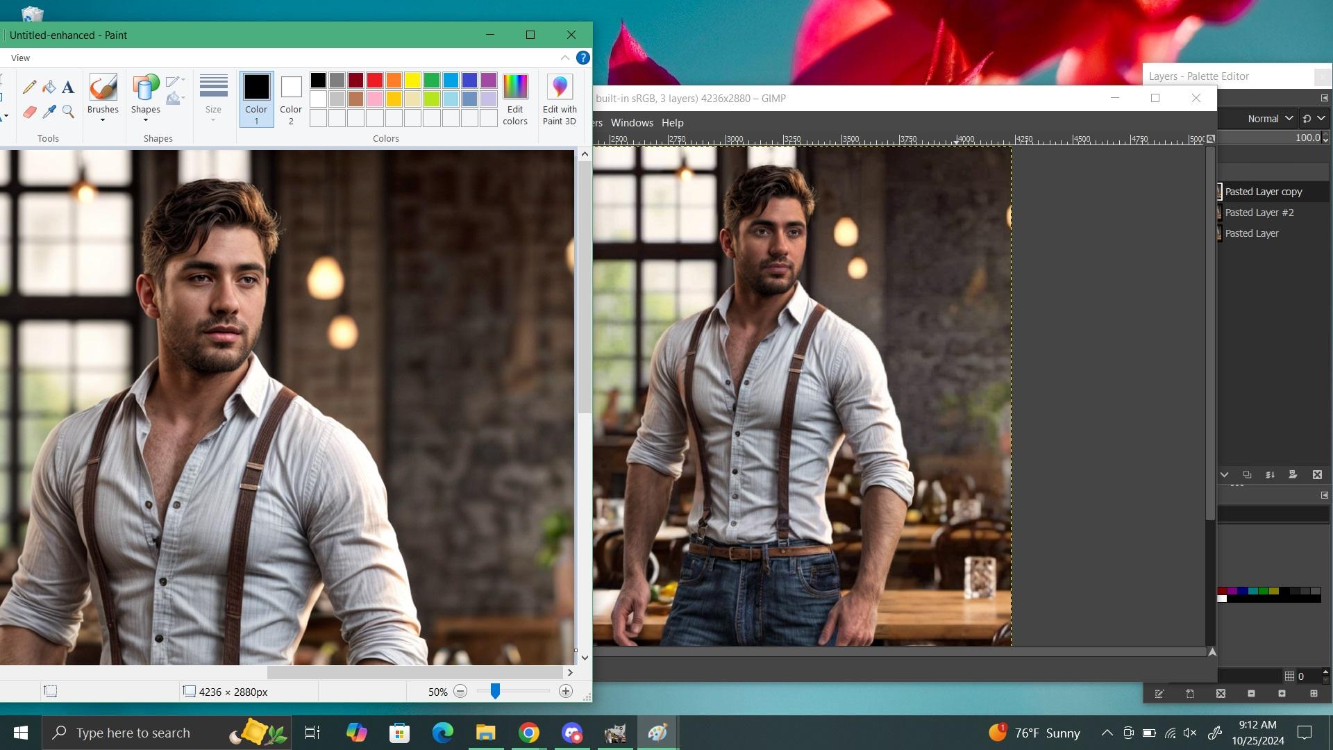I'm currently doing another KREA AI pic, that's essentially me trying to combine two different AI images that DAZ AI Studio gave me. Anyway, a "bias" that this AI has is that it keeps trying to lighten up the Michael 9 skin. So when I'm working, I have to figure out how to darken it back to how Michael 9 is supposed to be. The MS Paint pic is the KREA AI enhancement. The GIMP pic is my current WIP where I've finished combining Michael 9 to the enhancement.