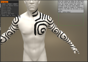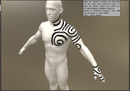 The second cropped screenshot is the redone arms on GIMP. They were tricky to do since the arm maps aren't perfectly mirrored. As a result, the arm swirls are actually a bit asymmetrical. His left arm is acceptable, just need to fix his pinky, but his right arm needs work. I will have to repaint his right arm and possibly redraw the swirls. His torso/body texture will be easier to make symmetrical. So perhaps I should try working on it before I try the right arm.