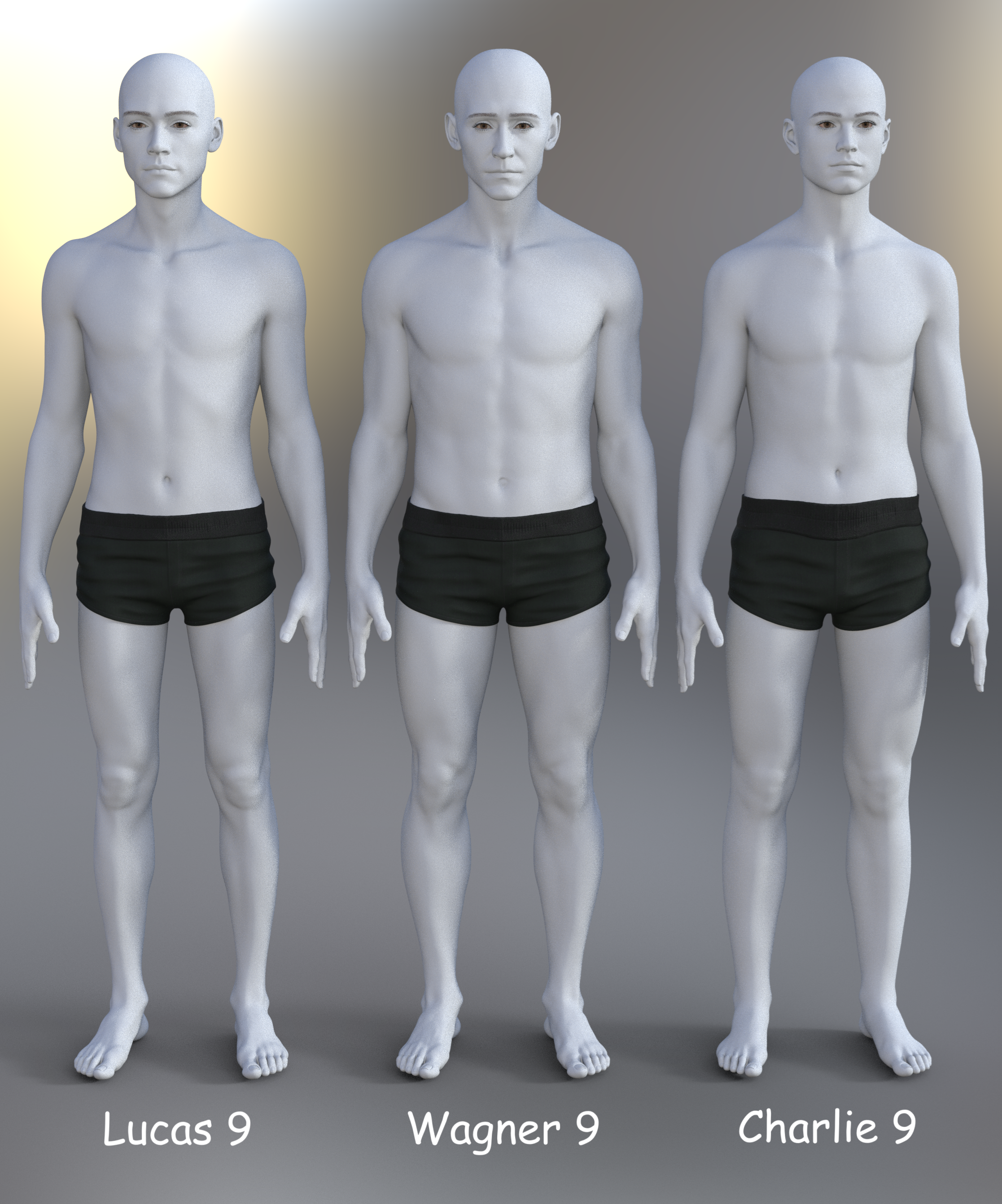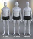 Speaking of Lucas 9 and Charlie 9, I remember that I had initially passed on both since I thought that Wagner 9 was good-enough for my "skinny guy" needs. I regret not rendering Wagner here, but I don't remember seeing a comparison of Lucas and Charlie, so I made one real quick. Wagner has very defined legs, at  least the SD version I always use. Maybe I'll update this post later with all 3, when I'm not too busy. Updated with a render. No skin textures, so you can see their shapes more clearly...though I made them wear boxers as a precaution against my images being pulled.