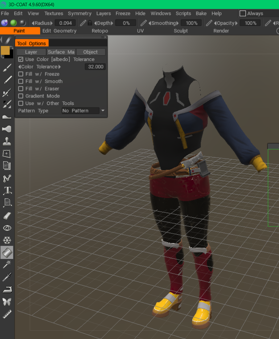 I think I fixed what was wrong with 3DCoat where it crashed when using the Paint Bucket/Fill option. I checked on "Use Color Tolerance" and it no longer crashes. I may change the boot colors, but the main shoe part must remain yellow. This is what I meant by "Kingdom Hearts Mickey Mouse" color palette.