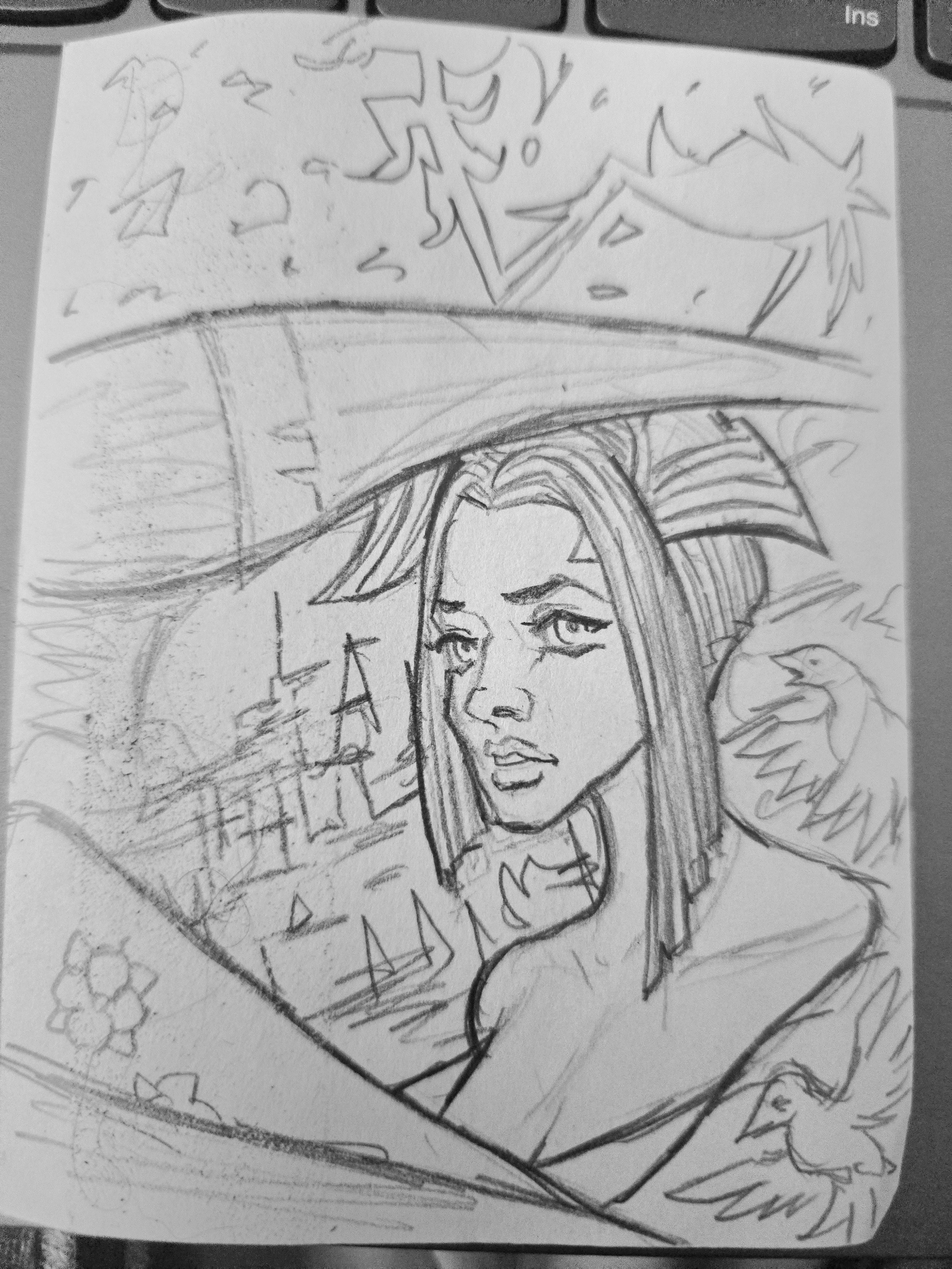 The photo of my tiny traditional sketch and a screenshot of my digital canvas, where the AI image is underneath to show how I kind of eyeballed it to be similar.