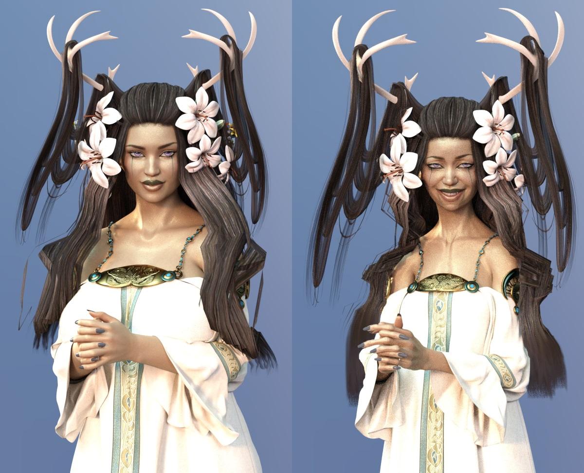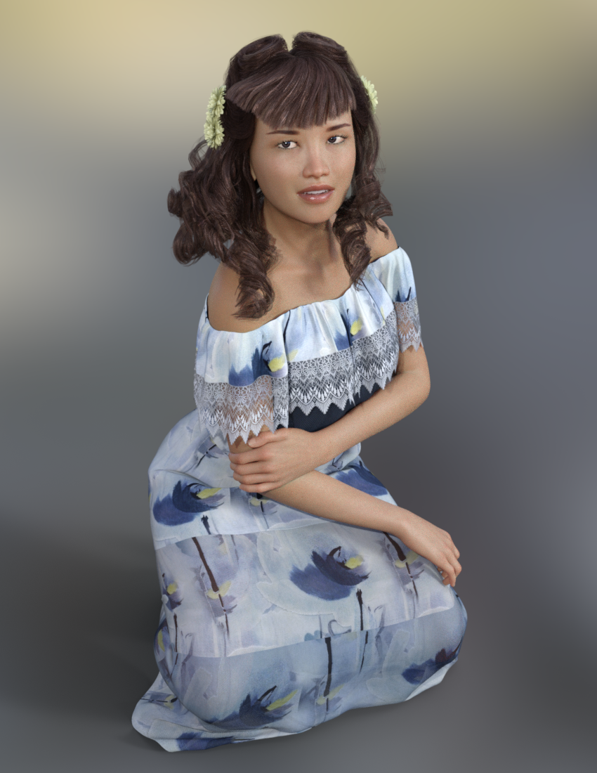 I tried to render the Muse Dress for G8F. This time, I used the Fawna Hair for G3F and Aiko 7 skin with the diffuse color changed (base color, I think? I forget what it's called. XD) Originally, this was just with Biana, which I stopped at 58%. Then I switched the shape to Edie 8 and did some adjustments and some postwork for both.