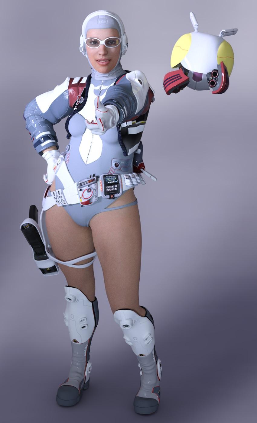 Actually, the first experiment I did with the Aurous Iray Lights was this scene with my avatar wearing the Liquid Halo On Sky 16 for Genesis, with the default base Iray shader applied (and base texture changed to light gray instead of white.) The boots do have a smooth modifier applied to them because they had these ugly blockiness on the soles. For artistic purporses, I used Young Minto's skin with the yellow tint on my avatar, instead of the Joanna skin. The background HDR comes from FWSA Soft Light Probes, which was a past Christmas Freebie that's no longer available. (The little droid, Gumi, comes with the Liquid Halo On Sky 16 outfit.)