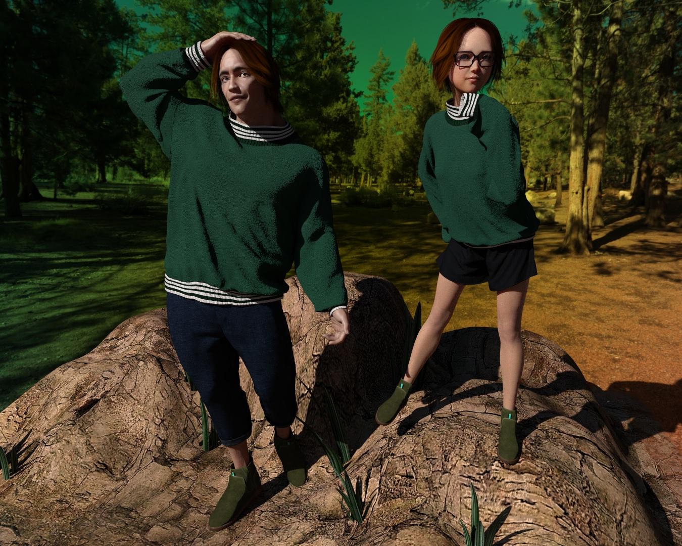 I still don't know why this outdoor HDR renders green. Originally they were going to wear matching yellow sweaters but it looked too bright in the lights and it was easier to go with green. The ground prop is from an item that is unavailable for sale anywhere as far as I know. And yes, this render was edited in GIMP, I played around with the colors and tried to make them pop out some more. I'm actually really pleased with this Iray render. I think it looks nice and I accomplished what I wanted to do and that was making Ronan look like a regular guy. I'm pretty sure this is one of the reasons that no one suspects Clark Kent of being Superman. He looks like some big awkward cute nerd. XD