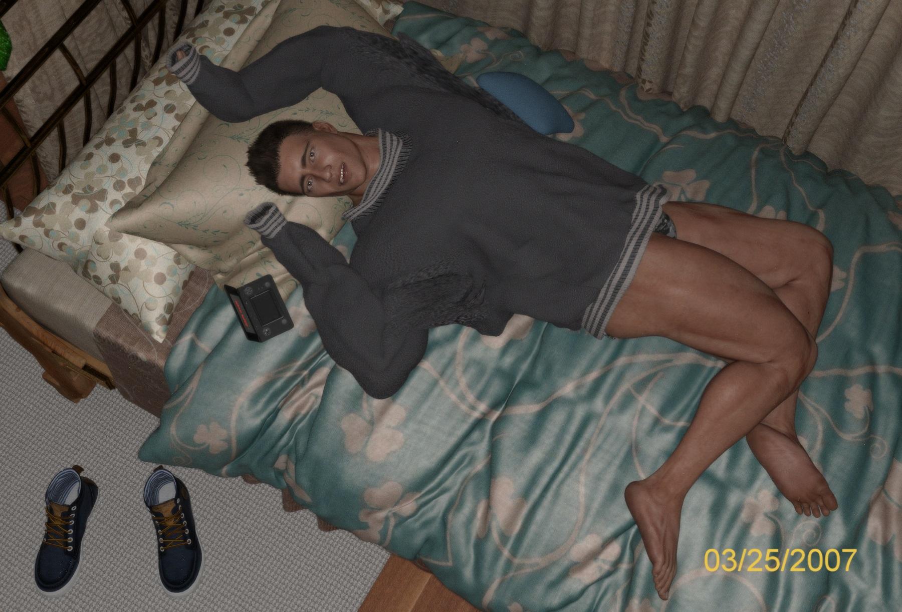 He's on the Daybed Romance in Apartment 39. Those shoes are from Cute3D High Tops. (These were also used in the previous Pharah render.)