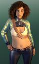 Here I did a quick render, still using Joanna's textures for the character. As for the outfit, the top come from Harpoon Girl Outfit for Genesis 2 Female(s), the pants and earrings are from Looking Back Outfit for Genesis 8 Female(s), and finally the hair is from Miranda Hair for Genesis 3 & 8 Female(s). (Personally, the Pascale Hair by AprilYSH would look like my actual hair since it's of similar length but the curls look looser and probably more similar to the Karissa Hair. But whatever, with this G8F avatar I can have whatever hair is in my Product Library. XD) As for the clothing shaders, they are a freebie set (Shimmery Sheer II Shader Presets for Iray by AllenArt over at ShareCG) and the leather + metal default Iray shaders.
