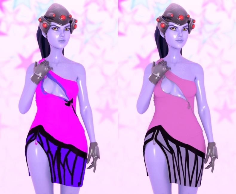 This is Widowmaker G3F by guhzcoituz, except the character texture, hair, and head prop are on G8F. And she is wearing the Stylish Zipper Dress by Pretty3D (from Renderosity). I did these renders a while ago, but I kept forgetting to post them on this thread. But the point was that I wanted to re-texture the outfit for it to be Overwatch Widowmaker's default colors. Here is side by side of the coloring I did with Sculptris and the more polished colors I did with GIMP, using the Sculptris colors as the base.