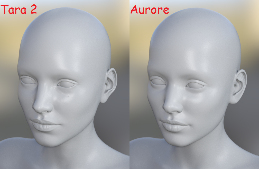I've been wanting to do this for a while, but a sort-of side by side comparison of Tara 2 and Aurore by Kayleyss. No textures.