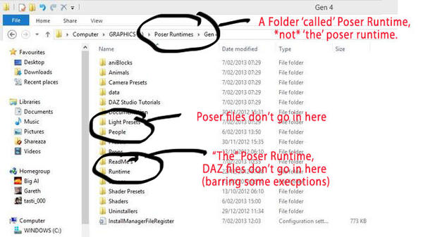 We aren't talking about the same thing. Tastiger's graphic shows a complete folder structure under Gen4 *which has separate poser and daz parent folders inside it.* My folder structure was refering to a single library where the point I was referring to was specifically the 'separate poser and daz folders.' Try taking a look at the two different folder structures, they are apples and oranges. My point is, inside the 'Gen4' folder structure shown, one 'cannot' combine the poser and daz content both within say the runtime folder so that the DAZ duf files are in the same folder as the pz files.