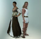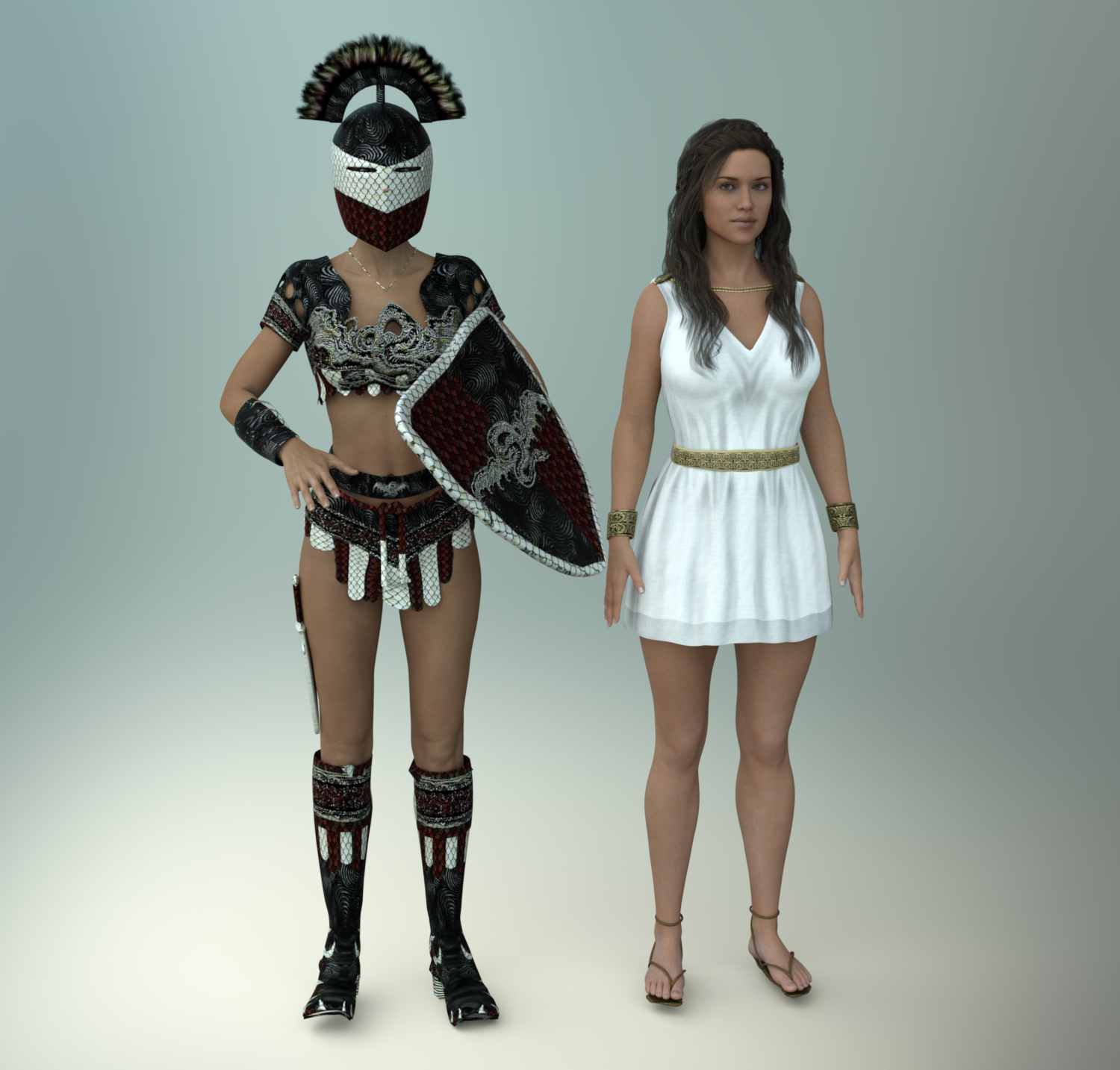 The feet are still an issue, but the rest fits very well. For the Olympian, the sandals fit fine, in the default T pose. But if you choose any other pose, they go wonky. That's why Olympia 7 looks like a Barbie doll here, I just put her arms down, but left her lower half in the T pose.