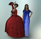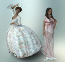 Here are two of the textures from the Historic Map Pak 2. The ideas behind these textures are very nice. They give different looks to the gowns, but they are very old and low res. I'm not sure there's a way to rescue them but could do something similar with retexturing. The lines are classic, and there are enough material zones to work with.