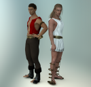 I've had a lot more luck with the women than the men. Not sure why. I would've expected the men to be easier to fit. Oh well. I can get the main parts of these outfits to fit, but not the arms and feet. The fantasy suit is a mess. I'm not sure it's worth trying to fix. The cuffs are not easily moved over. They're divided in weird places. The Olympian looks pretty good, but the cuffs and sandals don't fit there either. That's not a deal breaker on that one, since it's a simpler outfit. I'll probably use it somewhere, but I'm not even touching the fantasy suit for now. Too many issues, unfortunately, and I never did find those dials. They might get lost in the conversion or only be available in Poser.
