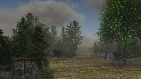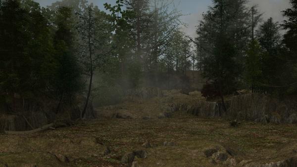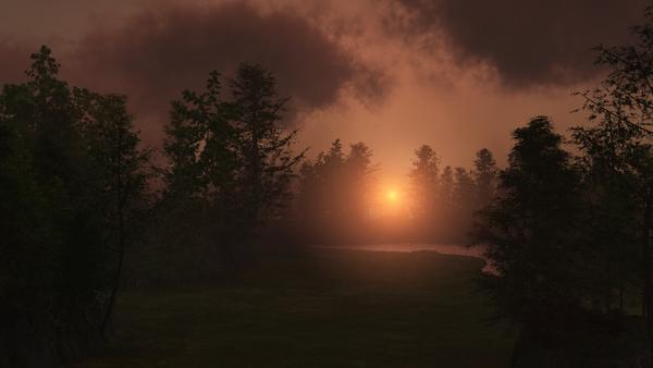 Here I just plunked in TheAntFarm's new "Shanty Town (Yaaay! I love this set!) to the Base Scene, cranked on some clouds and the ground fog, dropped in some deadwood and a big Woodland Block in the background. Nearly no tweaking involved.