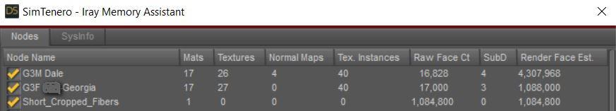 So my question is, what is the main cause of VRAM usage? Geometry or Textures? I will buy this product if I can be sure it reduces VRAM significantly in all cases but, from what I can see, it is most helpful with crowded scenes. I often have scenes with only two characters and a room with a few items of furnitue. That should be fine for my 8GB GPU but I am still getting times when it drops to CPU. According the the Sam Tinero Assistant a G3M Dale character is 4 times as VRAM-hungry as a G3F character. Also, I am using fibre hair (a product called Short Cropped Hair) which has no textures but has a lot of geometry.