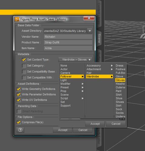 Now my problem is that all of the conformers I make/convert and save using "Figure/Prop Asset", all auto-conform to Genesis with or without the CMS running, yet so far nobody elses conformers, including the stuff that comes with Genesis, will auto-conform, they all need the CMS to be running. Mine are all tagged as "wearable" yet every other one is a "scene subset", the attached pic shows the asset save window, as you can see the Content type is "Follower" or one of it's sub types, this is what I always get with conformers, so the big question is why do you idiots change it to the wrong Content type, hell even doing it without the CMS running still gives me "wearable".