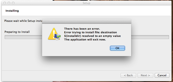 As for the installation issue, it looks like the program you're using either isn't finding the installation folder (installdir) or isn't creating it.