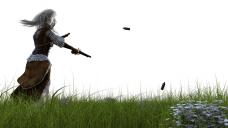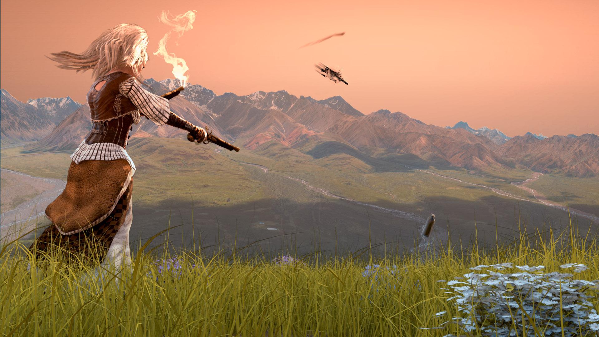 I started off with the idea of a woman target shooting some thrown bottles. Perhaps they were thrown by somebody else, but they could have also been thrown by herself and she is a quick pistol shot. The scene has frozen where she has shot the first bottle, which you can deduct by the shattered bottle and smoking gun (and perhaps the flying bullet above the bottle, as well) and is now aiming at the second bottle and is ready to shoot it. You can see she is in the wilderness/out on the range where she can fire the pistols for practice. And the outfit/wardrobe suits the guns. Stylish, but still useful/somewhat practical/believable for a gal holding a pair of pistols. Overall, I want to leave a sense of anticipation with the viewer: will she hit the second bottle or not? Perhaps they'll check the aim of the pistol to verify or see if she's on target. But they believe she'll hit it.
