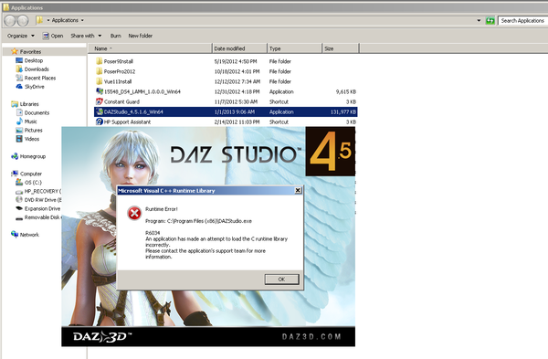 I've been using DS4.5 for the past 3 months, no problem. Suddenly this morning it won't load. When I click the desktop icon, the DS window pops up for a second, like it's going to load, then disappears and nothing happens. I've tried uninstalling and reinstalling (3 times) with no success. All of my other applications (Poser, Vue, etc.) work fine. I had originally loaded under Program Files, so on the last reinstall, I installed to Program Filesx86. When I try to run the program, I get the following pop up.