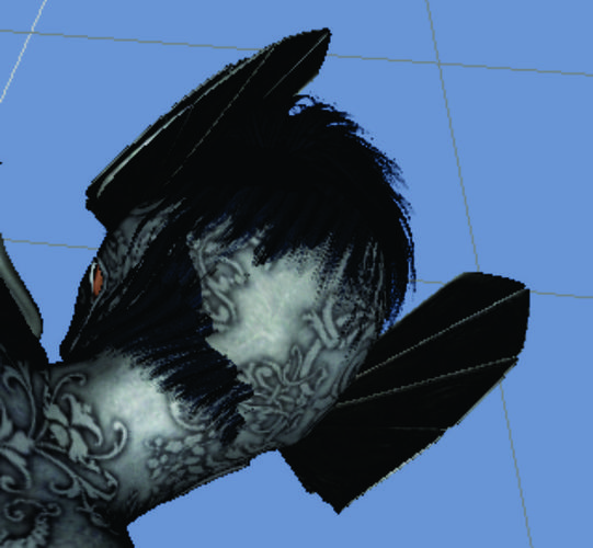 You can see the difference in what the original helmet looks like , I'll go get that image and be back in a few minutes and mine, which shows the hair (which I prefer.) Except for the back view which I am not going to show in a render anyway, this works fine for me. For the render (with scenery) it will probably be either the upper left or bottom left views anyway.