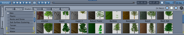 The tree will have multiple shading domains. To save the entire shader for all domains, select the tree in the instances tray, select the shading tab at the top of the screen and drag and drop the multi-colored ball to the appropriate category in the Shader Browser. You will be asked to name it. If it's one you've edited and want to overwrite the original, then leave the default name the same. If you don't want to overwrite the original, then name it differently!
