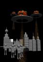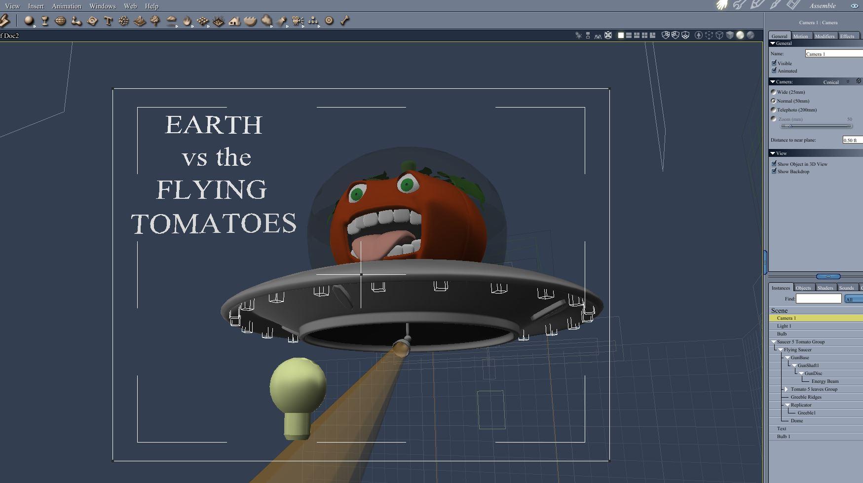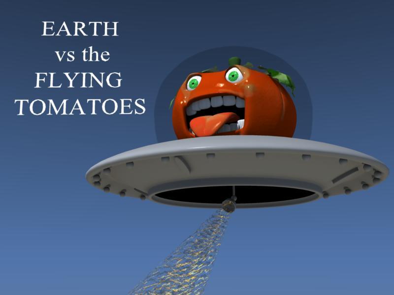 Earth vs the Flying Tomatoes will be developed more and then entered.  Here is another progress check.  The poster will have tomato saucers, tomato robots, a burning city, and of course the hero and heroine looking in the distance.  Here is the original poster and a few of the models in their current state - no shaders yet.
