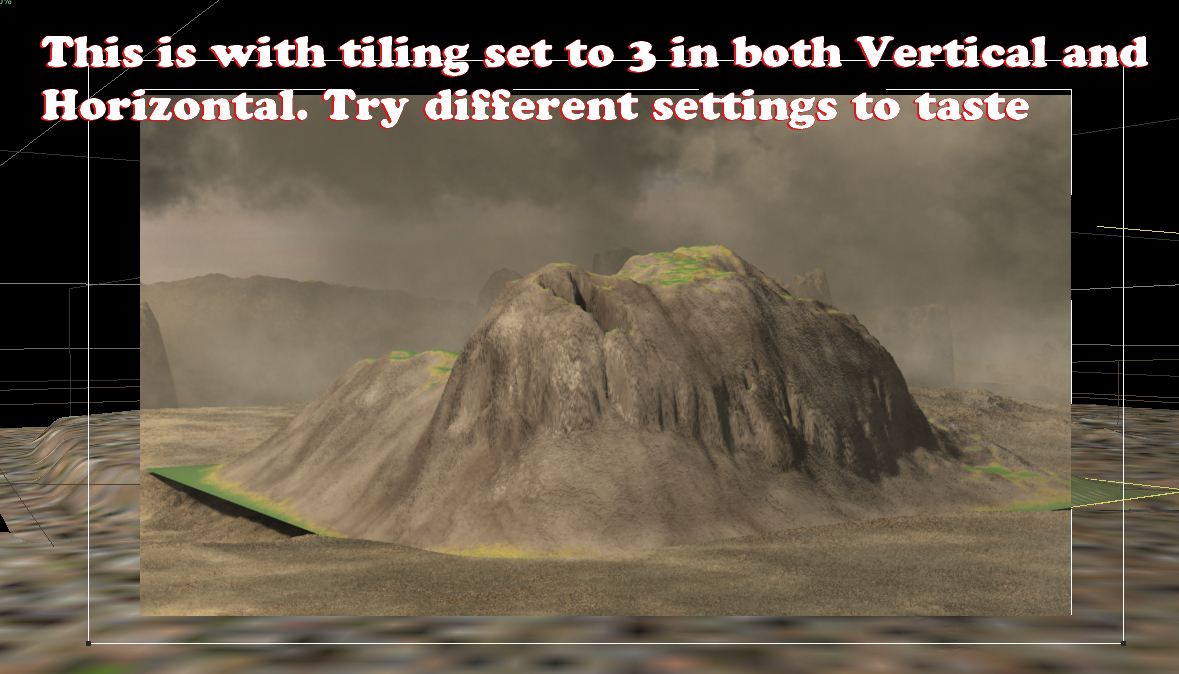 We have to take care in using different values, however, if we intend to place other elements directly on top of the terrain's surface. What looks right at one resolution is not at all correct for another. Simple fix - just set the viewing resolution the same as the final render resolution when placing the elements that need to sit just right.