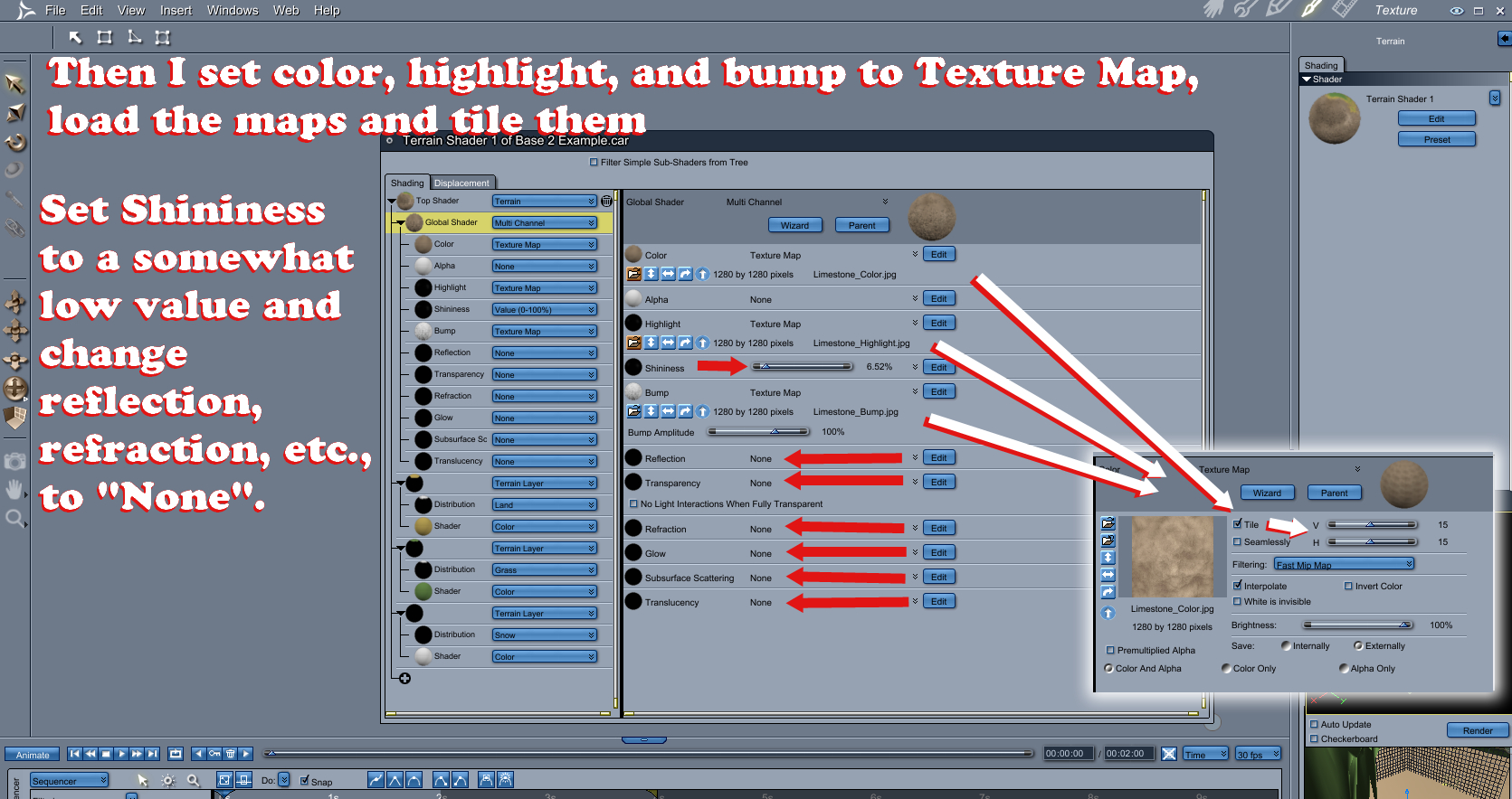 In short, I end up with Limestone_Color in the Color tab, Limestone_Highlight in the Highlight tab, and Limestone_Bump in the Bump tab, each tiled to 3 in both H and V