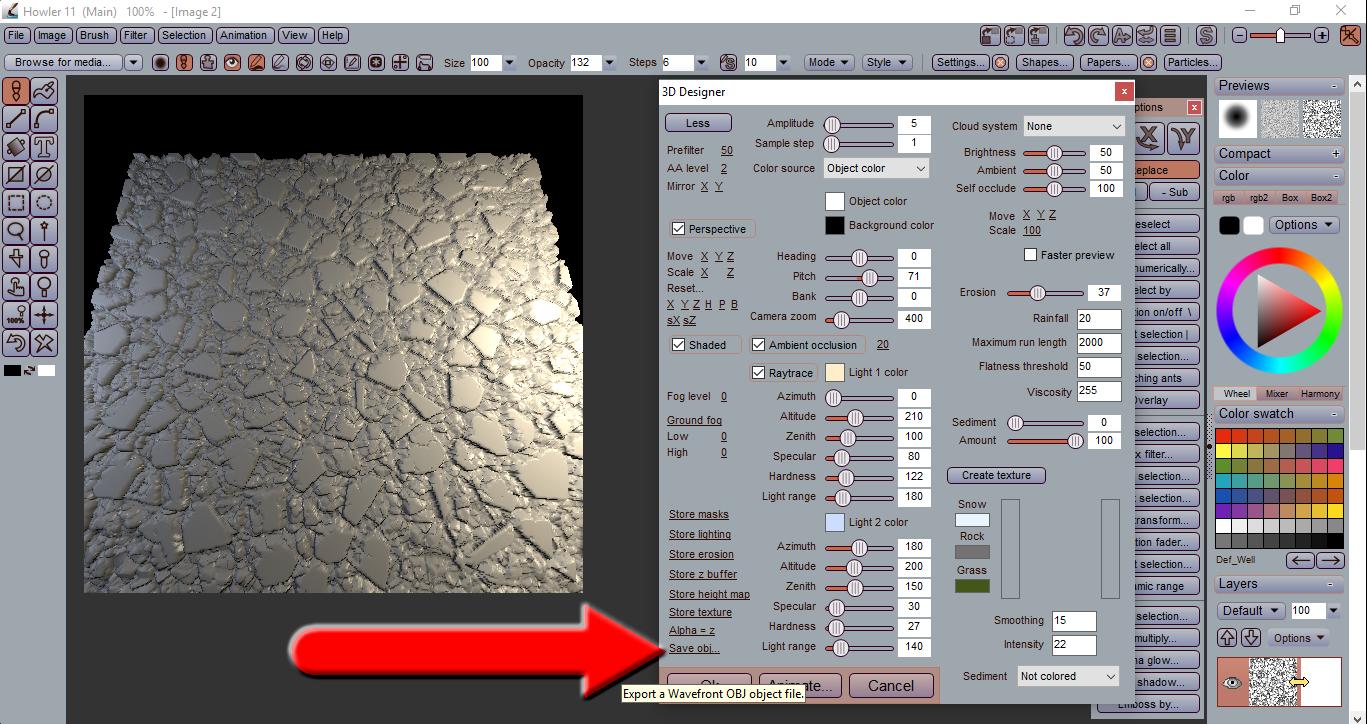To export an OBJ from Howler, we need to be in 3D Designer (Filters > Transform > 3D Designer)