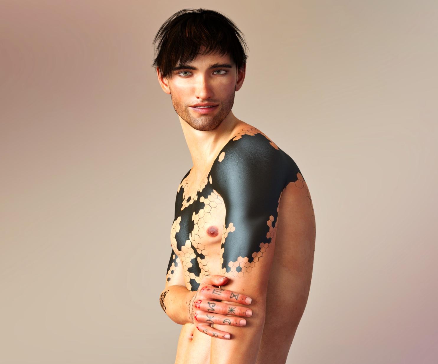 There are 5 Eye Colors and 2 Eyelash colors, along with a selection of tattoo options ranging from Black Out Torso/Arms/Head and Leg, to a few tattoos on his arms, and a mash up of all of them for greater variety.