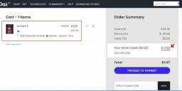Daz shopping Cart shows: $131.70 - $91.74 discounts = $39.96 - $5 credit = $34.96
