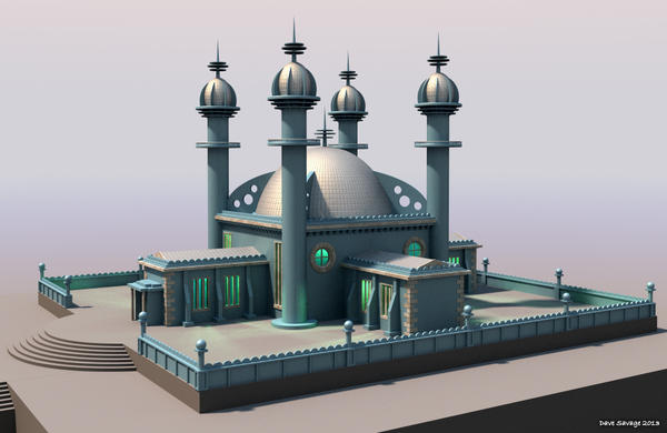 My plan is to create at least two versions of the model, one plainish (the pale blue & silver) and one with more complex stone and gold materials. All the mats will be Bryce procedurals and I'm thinking about organising the models into groups (or families but I've heard that families don't work too well on the Mac version) so that editing material areas (Stone parts, metal parts, paving parts etc.) is easy for further user customisation.