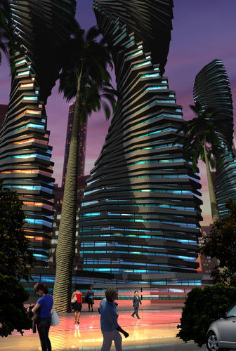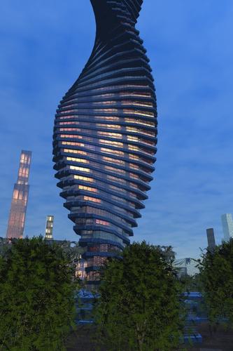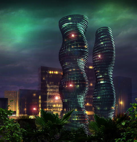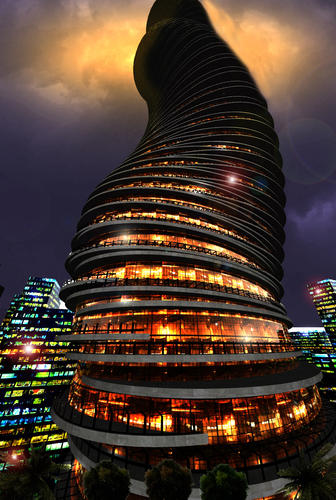 The middle of night appears in the city big towers one of them is this green tower with colored image , splash color , gray color please enjoy .....