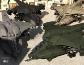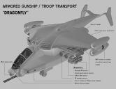Dragonfly is a heavily armed gunship / troop transport with vertical take-off and landing (VTOL) capabilty and can carry up to eight (8) troops in addition to the crew of two (gunner & pilot).