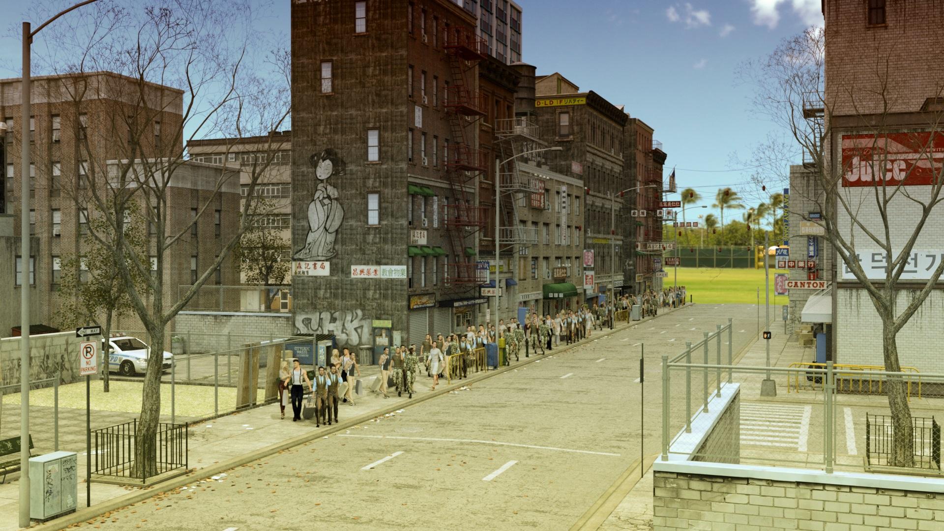 there is another one where the crowd on the sidewalk is seen from slightly above, their angle to the floor gets wierd