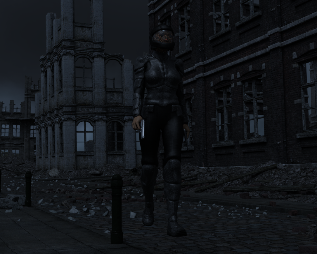 I am impressed you were able to get a V3 outfit on her. Right now the image is dark and has no real focus other than the character. Since this is a landscape challenge she should be a "prop" not the main focus.