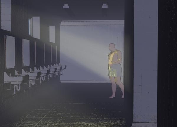 the other spotlight is on the floor and angled upwards , with a low intensity and tinted so as to simulate light reflected from the shiny floor.
