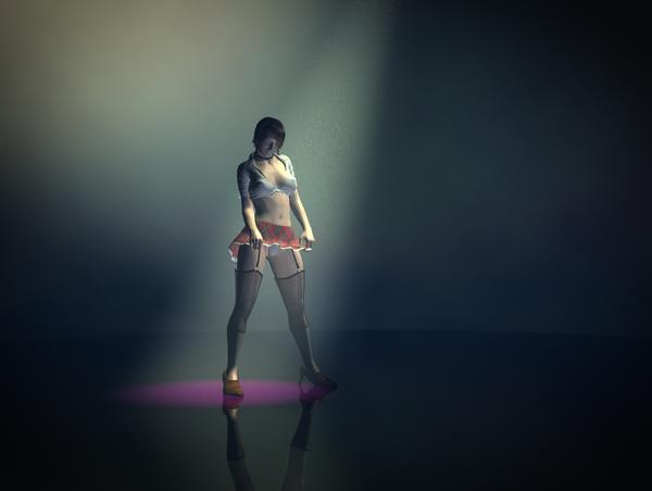 this is a nice simple set to show how to get the god rays from the volume camera. I have loaded a simple cyclorama backdrop (but even a vertical wall would do) and created a primitive plane for a reflective floor. I loaded genesis with a female shape, and a few clothes, then chose a nice pose. the only lights in the scene are two spotlights - one above Genesis and slightly to one side, then angled downwards. I viewed the scene through the spotlight, and then rotated and zoomed to get the light pointing where i wanted. I made the angle quite narrow, and made the light fairly intense.