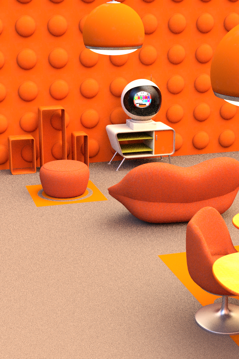 couple of images - both these are just test renders and as such, stopped VERY EARLY. So ignore the grain. In the second image, I loaded a retro pattern I have on the floor, to simulate carpet or lino, just to see how it went. Please note, the floor is blank and does NOT have that retro design, that is mine.