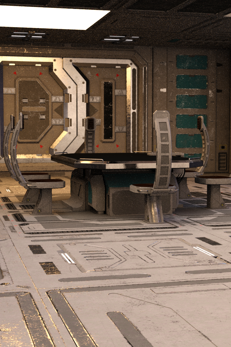 Image: This is the preload of the big empty room. I added the chairs and table which load together as I mentioned (there is also a single chair prop and single table prop to do it all separately). I deleted some of the roof panels and wall panels to get light in - and that big white light above the table..I just selected one of the roof panels and used "bulb 60 watt" from Real Lights for DAZ Studio Iray to make it look like a flurescent light panel and add more light. It's a quick test render so grainy, but just to give you an idea of the set. I used a HDRI for lighting and that's it (other than the Real Lights panel above) Let me know if anyone wants to see more of the set.